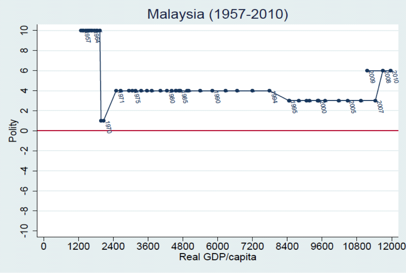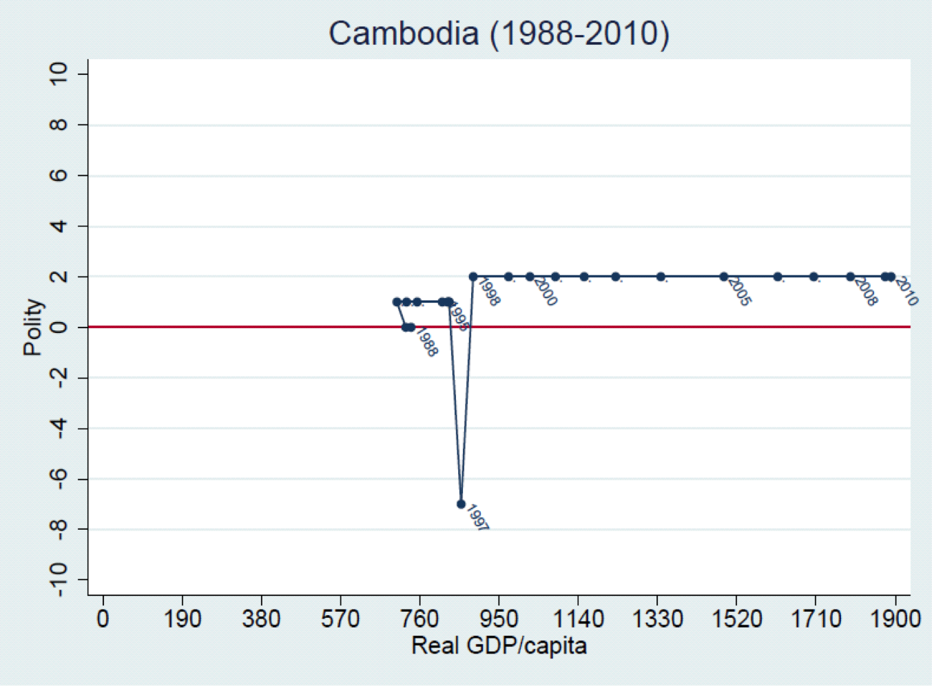 Democracy and Development Graphs are available by country with measures plotted over time. These graphs are based on regime data from Polity IV. GDP/capita is in constant 2005 $US from Penn World Tables (7.0) version 2. Click on a region to see a list of countries. Click on the country to see the corresponding graph (opens in a new window).